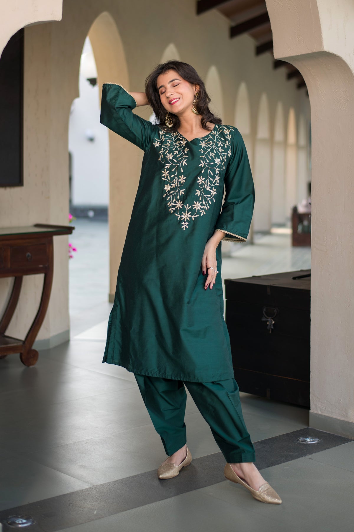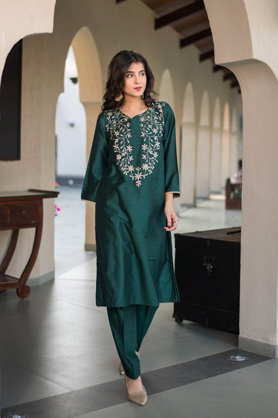 Bottle Green Kurta Embroidery Co-Ord Set