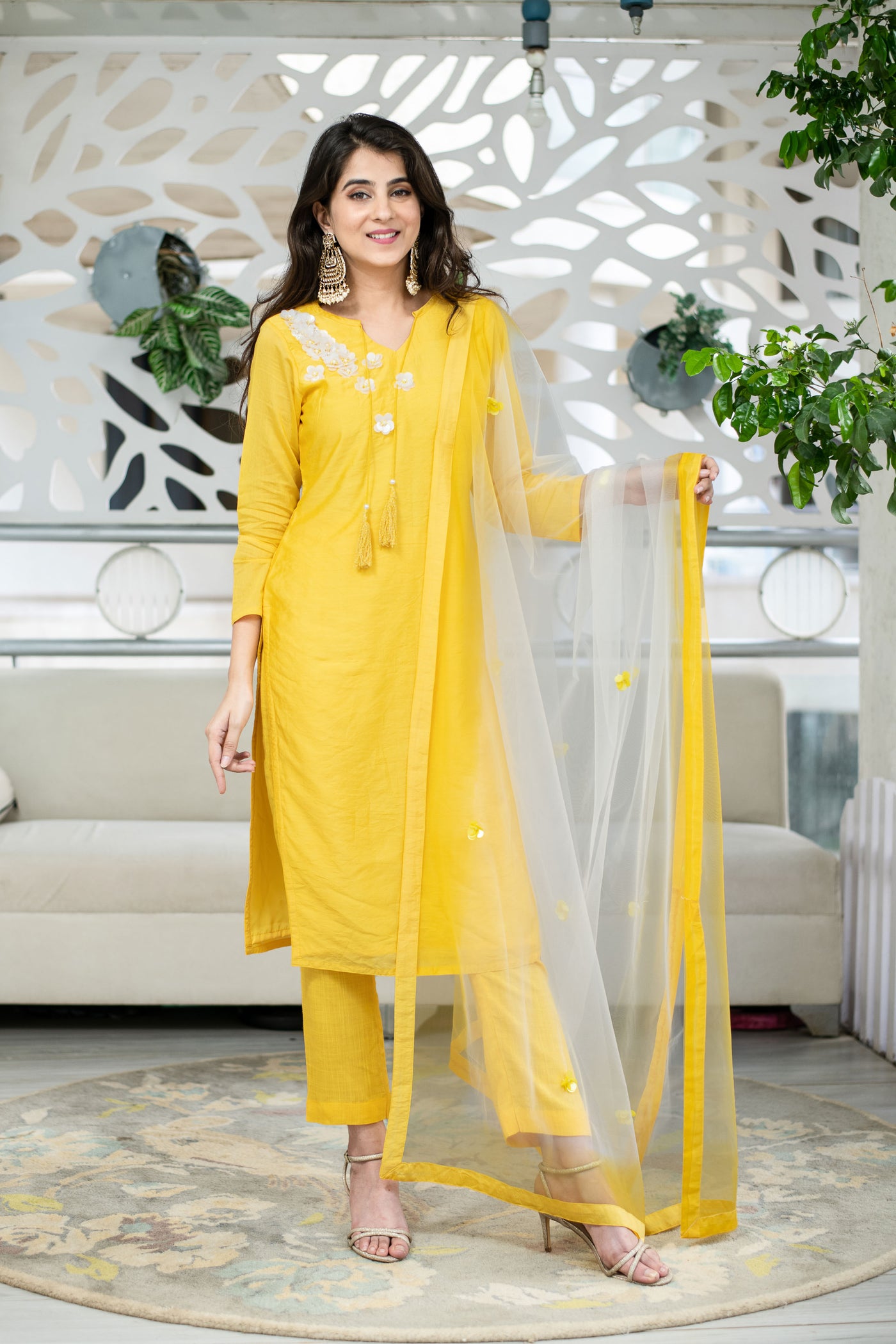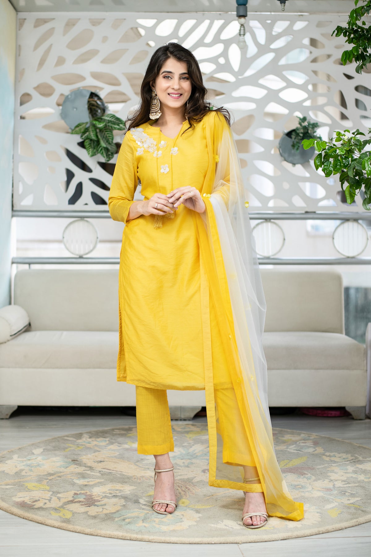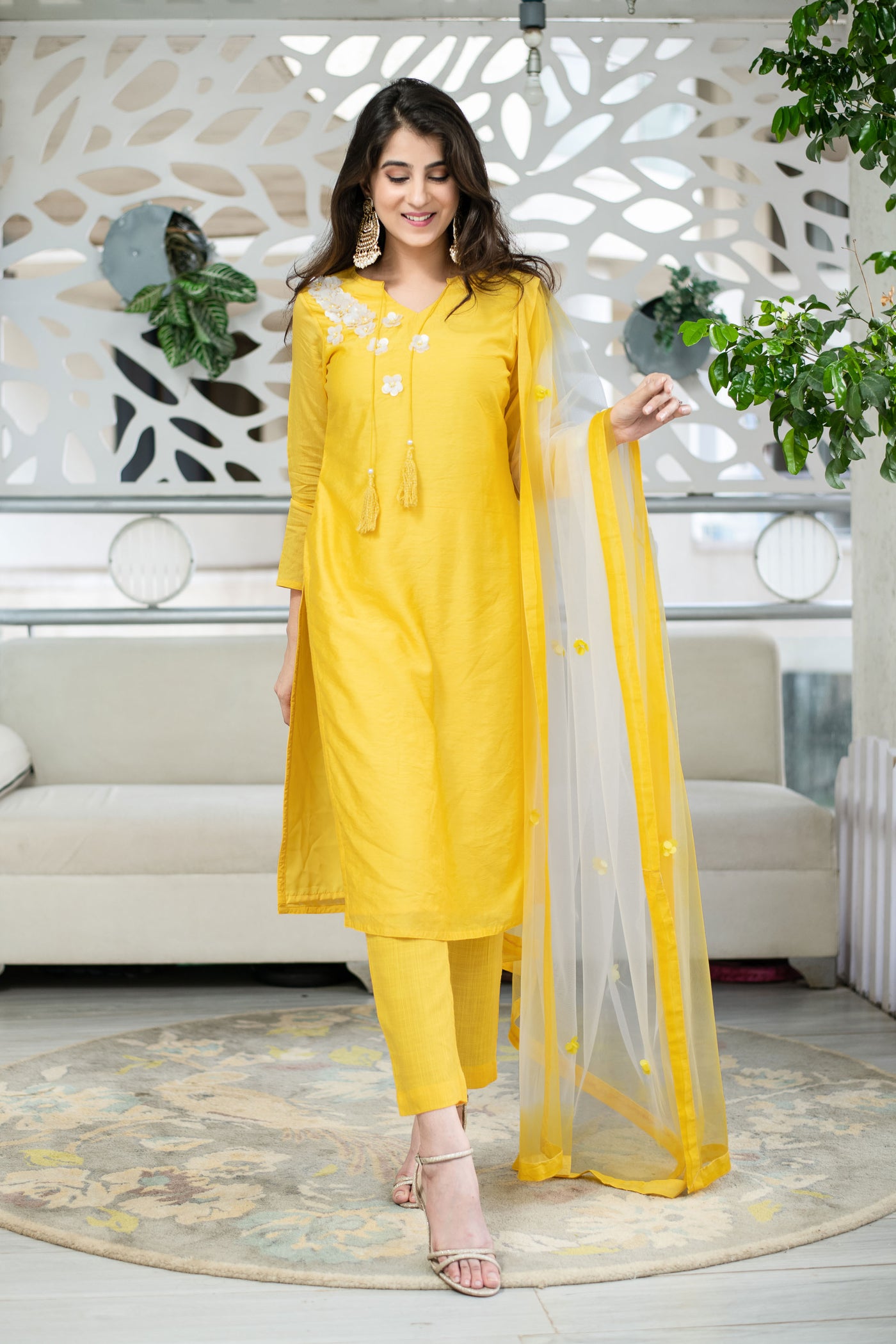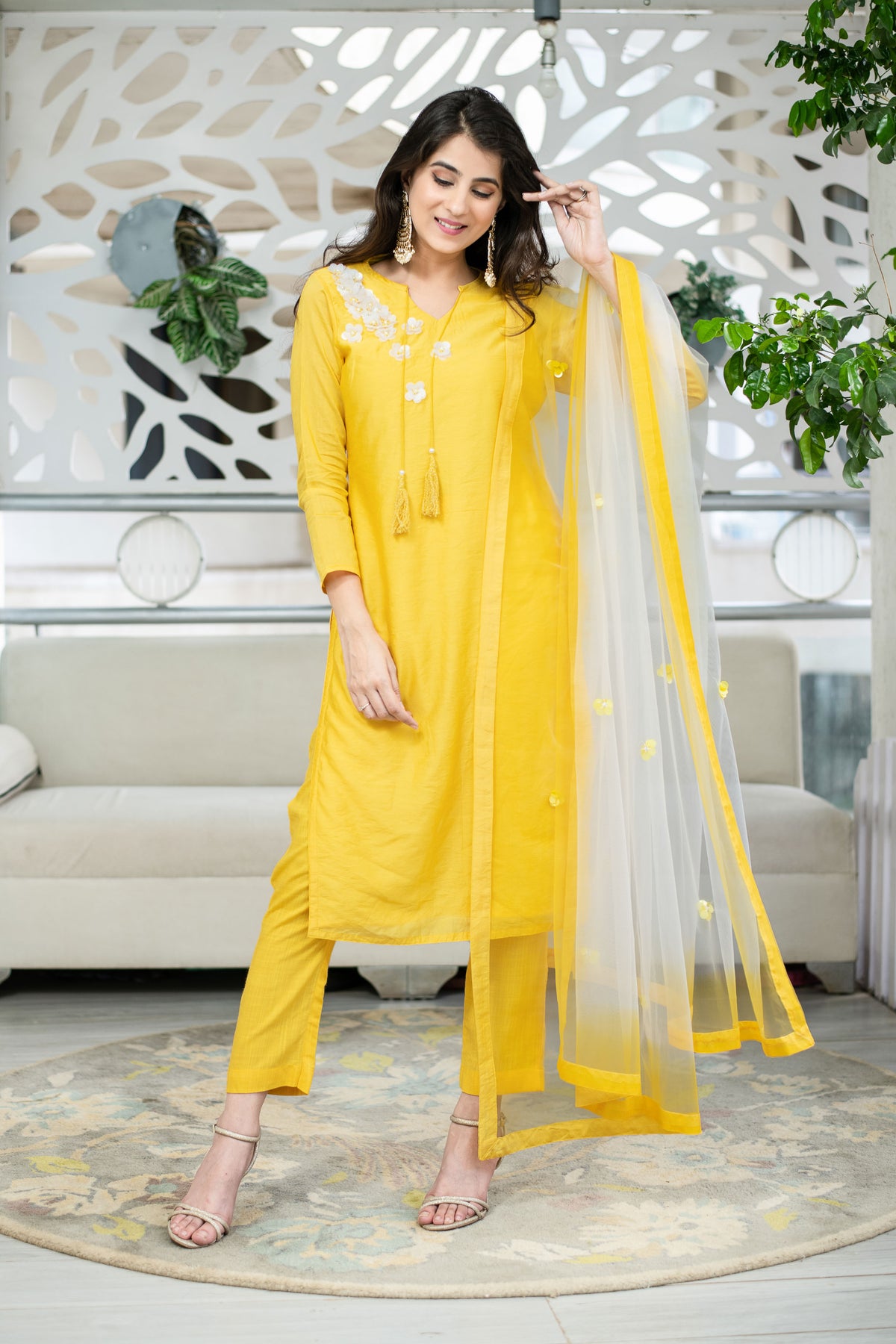 Yellow Chanderi Hand Work Kurta Set